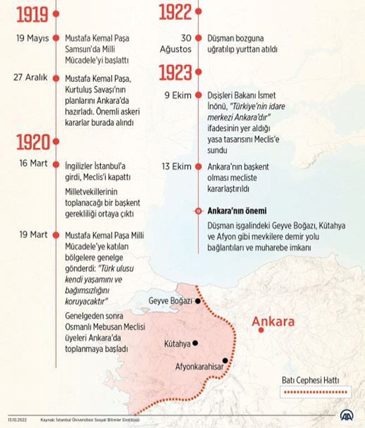 Türkiye Cumhuriyeti’nin kalbi Ankara’nın başkent oluşunun 102. yılı kutlanıyor. 102 yıl önce alınan kararla Türkiye’nin başkenti ilan edilen Ankara, Cumhuriyet’in simgesi ve bağımsızlığın merkezi olarak tarih sahnesindeki yerini aldı. Peki, Ankara ne zaman, nasıl başkent oldu?Milli Mücadele'nin merkezi Ankara, Anadolu'nun düşman işgalinden kurtarılmasından sonra 13 Ekim 1923'te genç Türkiye Cumhuriyeti'nin başkenti oldu.Birinci Dünya Savaşı sonunda yurdun işgal edilmesi üzerine Mustafa Kemal Paşa, 19 Mayıs 1919'da Samsun'a ayak basarak Milli Mücadele'yi başlattı. Osmanlı Mebusan Meclisi, son kez 12 Ocak 1920'de İstanbul'da toplanmış, 16 Mart 1920 günü İngilizler İstanbul'a girmiş, Meclis'in çalışmalarına son vermişti. Artık Osmanlı Mebusan Meclisi'nin İstanbul'da toplanma olasılığı kalmamıştı. Milletvekillerinin toplanacağı ve ülkenin yönetileceği bir başkent gerekiyordu.19 Mart 1920'de Mustafa Kemal Paşa, kimi illere ve komutanlıklara "Türk ulusu kendi yaşamını ve bağımsızlığını koruyacaktır" ifadesini içeren bir genelge gönderdi. Bu genelgeden sonra temsilcilerle Osmanlı Mebusan Meclisi'nden gelen üyeler Ankara'da toplanmaya başladı.Kurtuluş Savaşı'nda Ankara'nın önemi, düşman işgalindeki Geyve Boğazı, Kütahya ve Afyon gibi mevkilere demir yoluyla bağlantılı ve muharebe imkanlarının yeterli olmasından kaynaklanıyordu.Mustafa Kemal Paşa, Temsilciler Kurulu üyeleriyle 27 Aralık 1919 günü Ankara'ya geldi. Ankara'da halk ve Seğmenler tarafından büyük bir sevgi ve coşkuyla karşılanan Mustafa Kemal Paşa, Kurtuluş Savaşı'nın planlarını bu kentte hazırladı.Savaşın başarıya ulaşması için düzenli orduların kurulması kararı Ankara'da alındı. Bu ordular İnönü'de, Sakarya'da, Dumlupınar'da düşmanı bozguna uğrattı. 30 Ağustos 1922'de kazanılan Başkomutanlık Savaşı ile Kurtuluş Savaşı tamamlandı.9 Ekim 1923'te Dışişleri Bakanı İsmet Paşa, "Türkiye devletinin makarrıidaresi (idare merkezi) Ankara şehridir" ifadesinin yer aldığı tek maddelik yasa tasarısını Meclis'e sundu.10 Ekim'de İkdam gazetesinde yer alan haberde, "saat 2'den 6'ya kadar devam eden toplantıda İsmet Paşa ve arkadaşlarının verdikleri genelge gereğince Teşkilat-ı Esasiye Kanunu'na 'Türkiye devletinin makarrıidaresi Ankara şehridir' şeklindeki maddenin ilave edilmesinin kabul edildiği ve konunun bir sonraki gün Meclis'in genel toplantısında tekrar gündeme getirilip maddenin kanuniyetinin savunulacağı" ifade edildi.Aynı tarihli Tanin gazetesinde "Ankara Merkezi Hükümet" başlıklı haberde ise fırka toplantısında Ankara'ya Gazi Mustafa Kemal Paşa'nın adının verilmesi hakkındaki teklifin, toplantıya başkanlık eden Mustafa Kemal Paşa tarafından gündeme dahi alınmadığı bilgisi yer almaktaydı.Yasa tasarısı 10 Ekim'de Layiha Komisyonu'ndan, yine aynı gün Anayasa Komisyonu'ndan hızla geçti ve 13 Ekim 1923'te Meclis Genel Kurulu'na geldi.Tasarı, tartışmalardan sonra oy çokluğuyla kabul edildi. Oturum Başkanı Ali Fuat Paşa'nın "oy çokluğuyla" sözüne, bazı milletvekillerinin "oy birliğiyle" sesleriyle itiraz etmesi üzerine, Ali Fuat Paşa "Efendim kalkmayan el vardır. Oy birliğiyle diyemem, gördüm, büyük çoğunlukla kabul edilmiştir." diyerek oturumu sonlandırdı.Yasa teklifi şeklinde gündeme gelen bu konu, "Ankara şehrinin Türkiye devletinin başkenti olmasına ilişkin Malatya Milletvekili İsmet Paşa'nın 2/188 sayılı yasa önerisi üzerine Anayasa Komisyonunca düzenlenen 10.10.1923 tarihli mazbata TBMM'nin 13.10.1923 tarihli 35. birleşiminin 2. oturumunda okunarak olduğu gibi kabul edilmiş ve Ankara şehrinin Türkiye devletinin başkenti olması büyük çoğunlukla kararlaştırılmıştır." şeklinde karara dönüştü.Kabul edilen karar, Ankara'nın, Mustafa Kemal ve Heyet-i Temsiliye'nin kente gelişinden itibaren fiili olarak sürdürdüğü merkez olma özelliğini, başkent sıfatıyla taçlandırdı.Bu metin bir kanun değil TBMM kararı olduğundan, daha sonra Anayasa'da yer aldı.Mustafa Kemal Atatürk, Ankara'nın başkent olmasının önemini Nutuk'ta, "Bütün düşünceler, yeni Türkiye'nin başkentinin Anadolu'da ve Ankara kenti olması gerektiğinde toplanıyordu. Coğrafya ve strateji durumu en kesin önemi taşıyordu. Devletin başkentini bir an önce saptayarak iç ve dış kararsızlıklara son vermek çok gerekli idi." ifadeleriyle vurguladı.